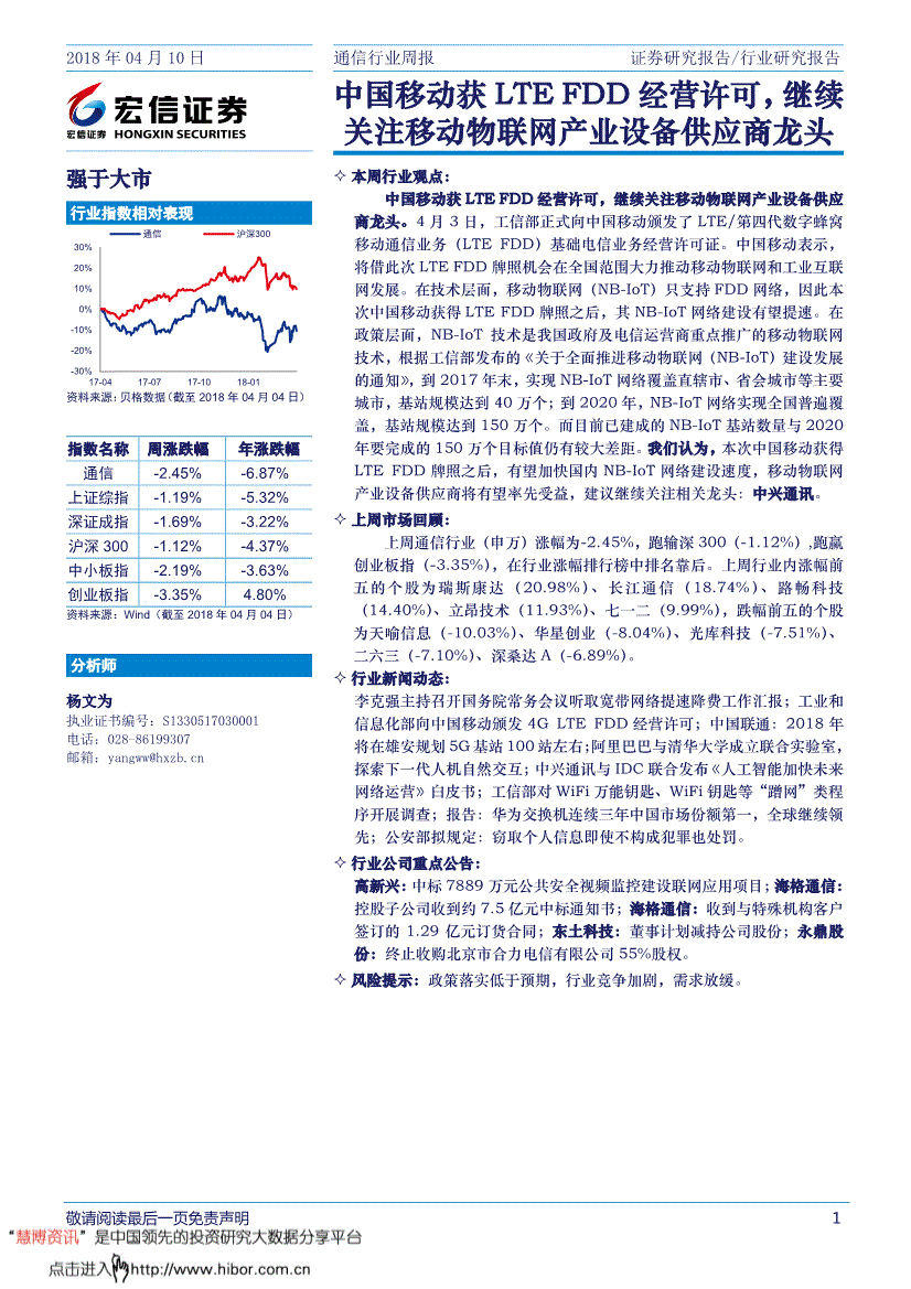 行业指数相对表示材料来历:贝格数据(截至2018年04月04日) 指数名称周涨跌幅年涨跌幅通信-2.45% -6.87% 上证综指-1.19% -5.32% 深证成指-1.69% -3.22% 沪深300 -1.12% -4.37% 中小板指-2.19% -3.63% 创业板指-3.35% 4.80% 材料来历:Wind(截至2018年04月04日) 阐发师杨文为执业证书编号:S01 电线通信沪深300 敬请阅读最初一页免责声明 2 证券研究演讲/通信行业研究演讲本周行业概念中国挪动获LTEFDD运营许可,继续关心挪动物联网财产设备供应商龙头。将借此次LTEFDD派司机遇正在全国范畴鼎力鞭策挪动物联网和工业互联网成长。基坐规模达到150万个。让企业更有合作力。“人机交互能力”是研发摆设的沉点之一。